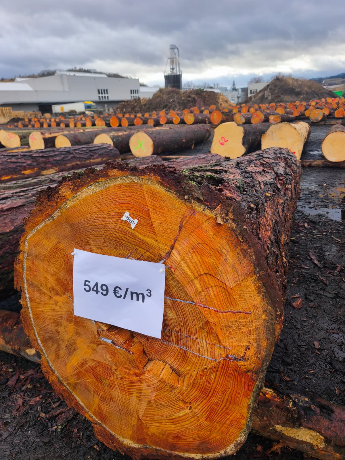 Nejlepší modřín se prodal za 13.313,- Kč/m3 (549,-Eur/m3). U smrku byla nejvyšší cena 4.350,-Kč/m3 (179 Eur/m³), u douglasky 4.486,-Kč/m3 (185 EUR/m³).