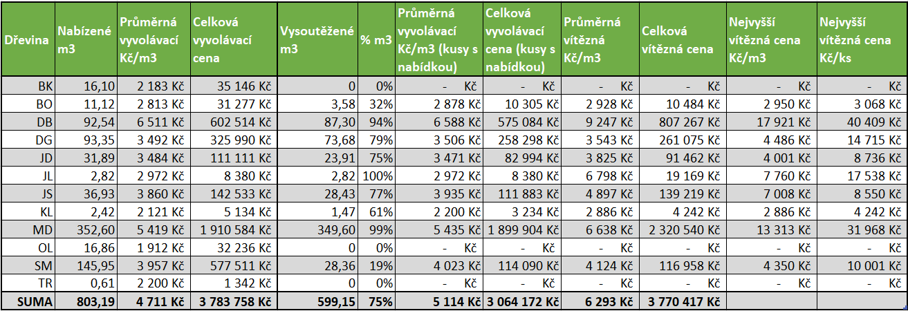 Na dražbě bylo draženo dříví 17ti vlastníků, dražby se zúčastnilo 16 zájemců, z nichž 13 podalo cenovou nabídku. Celkově bylo vydraženo 599,15 m3 (75 %) z celkového objemu 803,19 m³ nabízeného dříví.